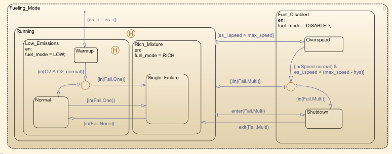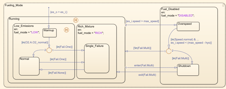 В sldemo_fuelsys/fuel_rate_control/control_logic, диаграмма Stateflow использует перечисленные данные для указания уровней топлива.