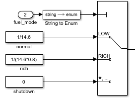Если fuel_mode порт выводит строку, ее можно преобразовать в перечисляемый тип данных для работы с выходными данными из блоков константы в этой модели.