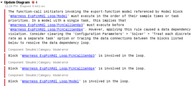 Если установлен флажок для параметра конфигурации Включить строгие проверки планирования для ссылочных моделей, то и проверки времени компиляции, и проверки времени выполнения гарантируют, что инициаторы будут вызывать вызовы функций на основе заранее определенного порядка планирования. Инициаторы сортируются на основе их временных приоритетов выборки. В этом примере порядок планирования и временные приоритеты выборки не совпадают. В mHarness_ExpFcnMdl модели отображается ошибка.