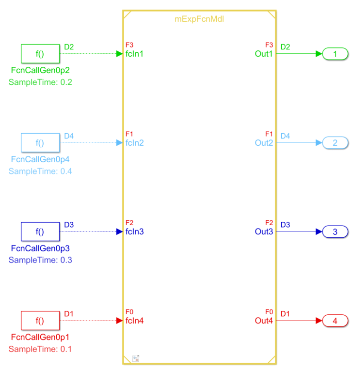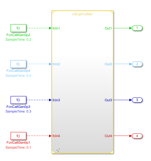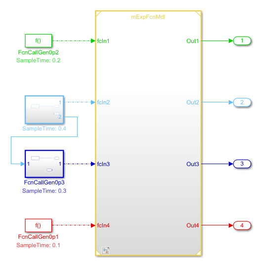 Модели Export-function включают блоки Function-Call Subsystem, блоки function-call Model, блоки Simulink Function на корневом уровне и блоки S-Function, вызываемые блоками Inport root function-call.