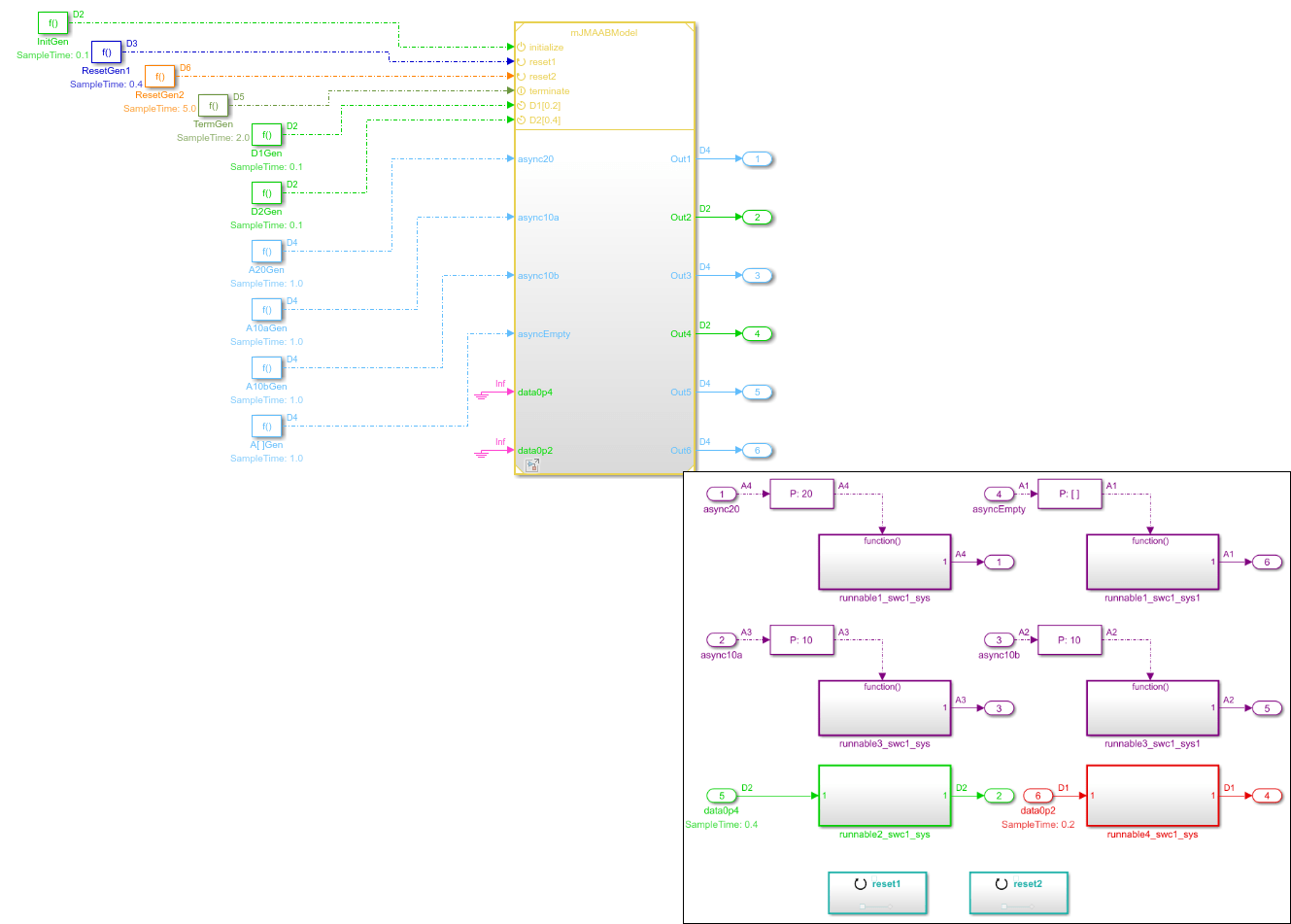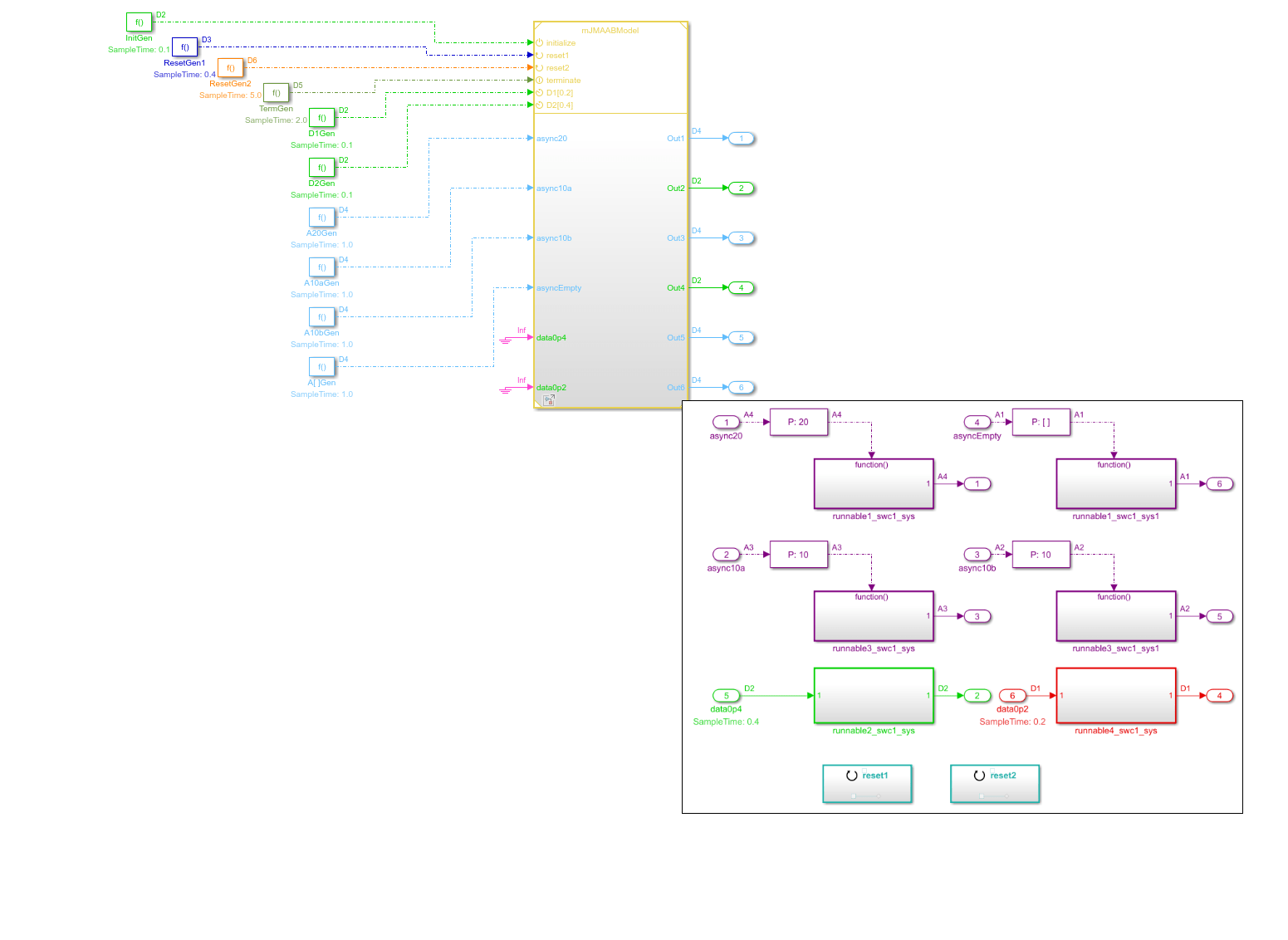 Добавьте порты событий вызова функции в блок Model в тестовом кабельном жгуте, который ссылается на модель на основе скорости или модель JMAAB-B, выбрав параметр Model block Schedule rates.