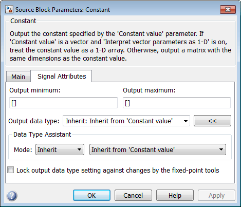 Помощник по типам данных представляет собой интерактивный графический инструмент, упрощающий задачу задания типов данных для блоков и объектов данных. Помощник отображается в диалоговых окнах блоков и объектов рядом с параметрами, обеспечивающими управление типами данных, такими как параметр Тип выходных данных. Например, он отображается на панели Атрибуты сигнала (Signal Attributes) диалогового окна Блок константы (Constant block), показанного здесь.