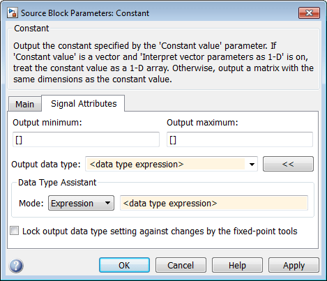 Помощник использует указанный тип данных для заполнения связанного параметра типа данных в диалоговом окне блока или объекта. В следующем примере параметр Output data type блока Constant указывает выражение, введенное с помощью ассистента.