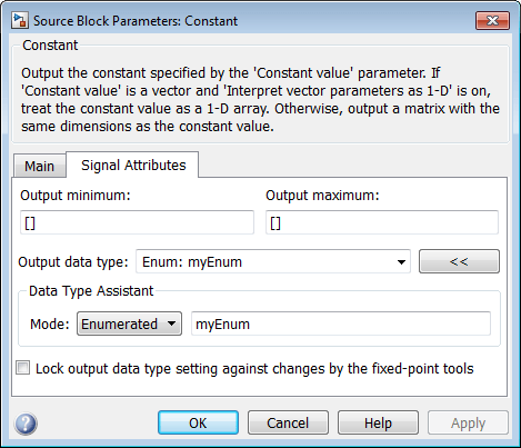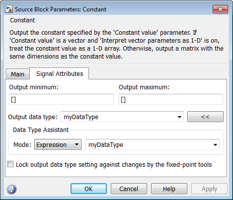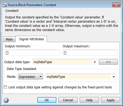 myDataType.BaseType = 'single'Этот объект типа данных можно использовать для указания типа выходных данных блока константы. Введите имя псевдонима типа данных, myDataType, как значение выражения в помощнике.