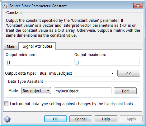 Можно указать объект шины в качестве типа данных для таких объектов данных, как Simulink.Signal, Simulink.Parameter, и Simulink.BusElement. В обозревателе моделей в диалоговом окне Свойства (Properties) для объекта данных в параметре Тип данных (Data type) выберите Bus: <object name> и укажите объект шины. Вы также можете использовать Expression для задания объекта шины.