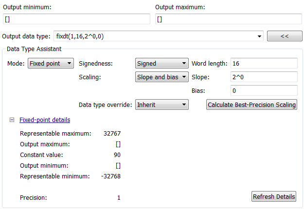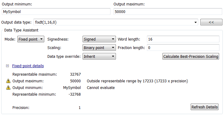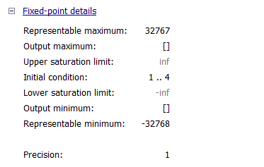 Строки с меткой Representable minimum, Representable maximum, и Precision всегда появляется. Эти строки показывают минимальное значение, максимальное значение и точность, которые могут быть представлены типом данных с фиксированной точкой, отображаемым в настоящее время в помощнике по типам данных.