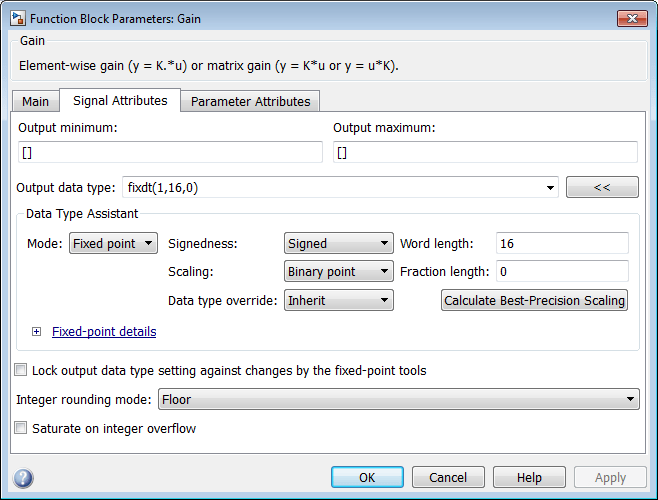 При использовании режима помощника по типу данных Fixed pointПомощник по типам данных отображает поля для указания информации о типе данных с фиксированной точкой. Например, на следующем рисунке показано диалоговое окно «Параметры блока» для блока усиления с выбранной вкладкой «Атрибуты сигнала» и указанным типом данных с фиксированной точкой.