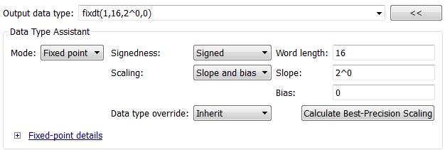 По возможности используйте двоичное масштабирование для упрощения реализации данных с фиксированной точкой в сгенерированном коде. Операции с данными с фиксированной точкой с использованием двоично-точечного масштабирования выполняются с простыми битовыми сдвигами и устраняют дорогостоящие реализации кода, которые требуются для отдельных значений наклона и смещения.