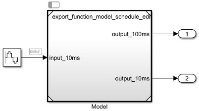 Тестовая модель Simulink используется только для моделирования. После тестирования моделирования создайте код из модели export-function, а затем вручную интегрируйте экспортированный код функции с планировщиком с внешним кодированием. Ссылка на модель export-function из блока Model позволяет добавлять события function-call и регистрировать сигналы данных для тестирования без изменения самой модели.