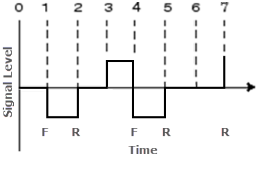 На следующей временной диаграмме для дискретной системы восходящий триггерный сигнал (R) не возникает на временном шаге 3. Триггерный сигнал остается в нуле только в течение одного временного шага, прежде чем сигнал увеличивается от нуля.
