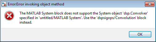 Системный блок MATLAB поддерживает только системные объекты, написанные на языке MATLAB. Если программное обеспечение может идентифицировать альтернативный блок, оно предлагает этот блок в сообщении об ошибке, например: