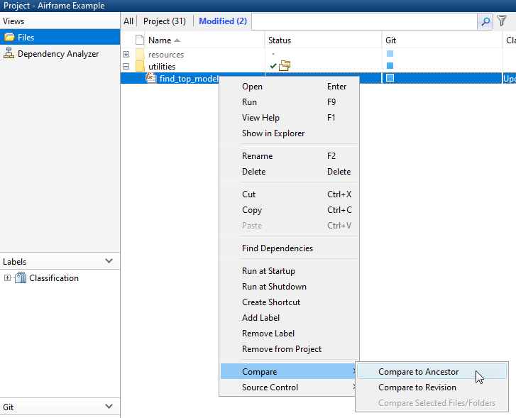 Можно также попробовать этот пример проекта с помощью системы управления версиями SVN, указав sldemo_slproject_airframe_svn. В следующем примере показаны параметры при использовании Git.