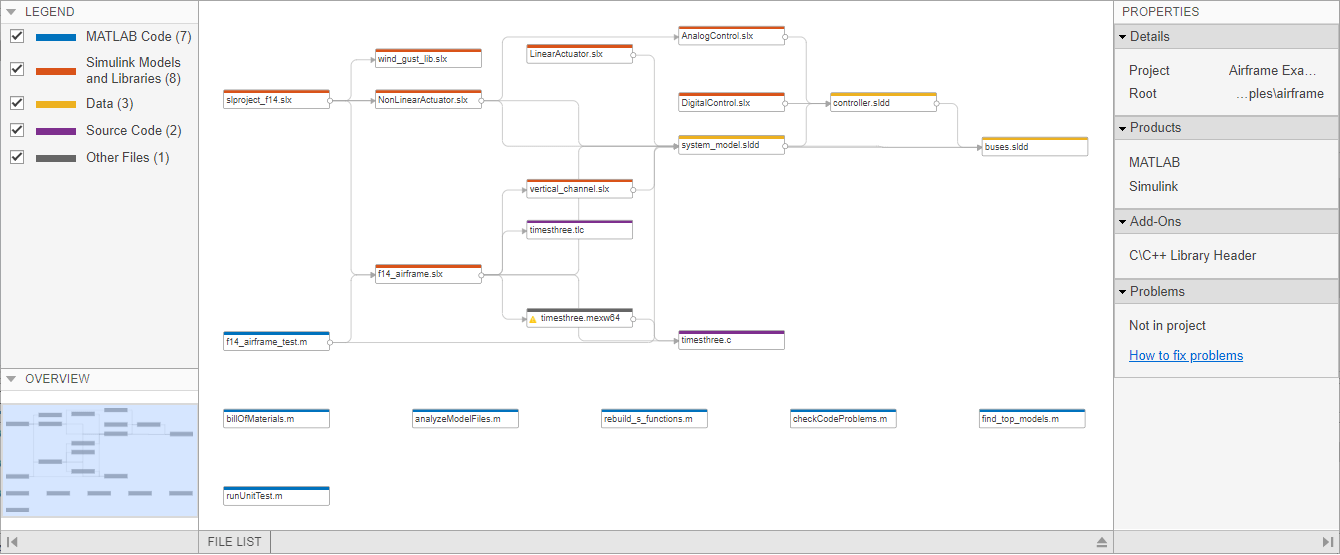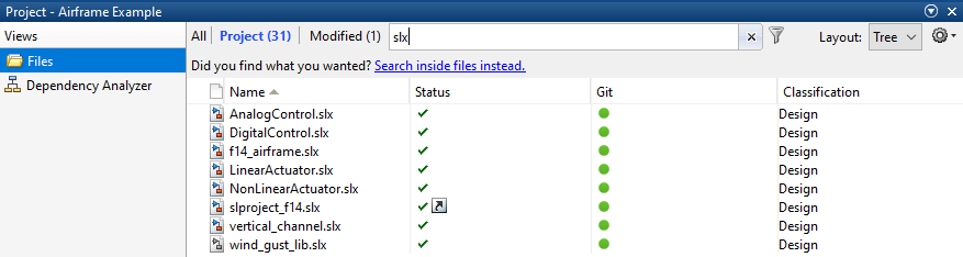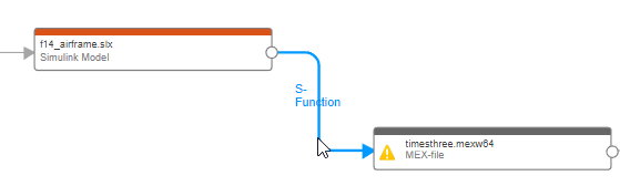 Выберите стрелку зависимости, чтобы проверить тип зависимости. timesthree.mexw64 - двоичный файл S-функции, требуемый f14_airframe.slx. Можно добавить двоичные файлы в проект или, как в этом проекте, предоставить служебный сценарий, который регенерирует их из исходного кода, являющегося частью проекта.