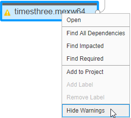 Чтобы удалить файл из списка проблемных файлов, щелкните его правой кнопкой мыши и выберите «Скрыть предупреждения». При следующем выполнении анализа зависимостей файл не отображается как файл проблем.