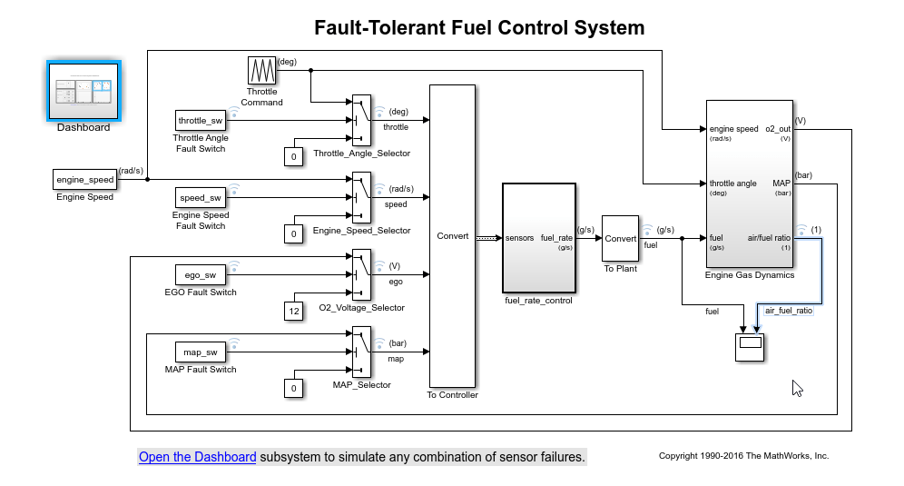 Подсистема пульта управления содержит блоки для управления и визуализации сигналов в модели отказоустойчивой топливной системы управления. Изучите связи между сигналами и блоками панели мониторинга. Щелкните сигнал или блок панели управления, чтобы выделить соединения.