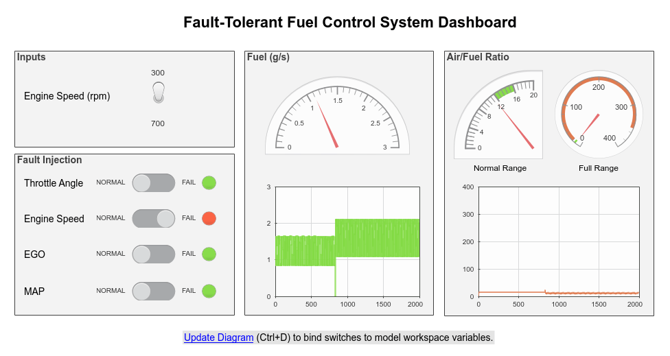 Наблюдать за изменениями в fuel и air_fuel_ratio сигналы в блоках «Область панели управления» и «Датчик» при переключении каждого переключателя.