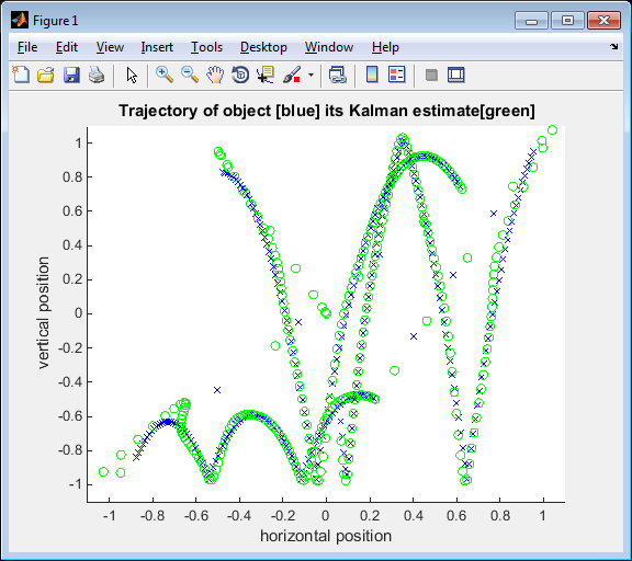 Когда Simulink запускает модель, он отображает траекторию объекта синим цветом, а фильтр Калмана оценивает положение зеленым, как и раньше.