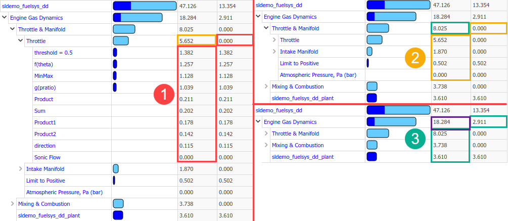 Для начала рекурсивно разверните иерархию подсистемы Engine Gas Dynamics. Для подсистемы Throttle общее время ее составляющих (от порогового значения = 0,5 до Sonic Flow), подсвеченное красным цветом. Обратите внимание, что сумма времени их выполнения вместе с собственным временем для блока дросселя представляет собой общее время блока дросселя, показанное желтым цветом.