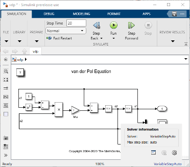 При моделировании модели автоматический решатель выбирает решатель с фиксированным или переменным шагом в соответствии с настройками и вычисляет рекомендуемый максимальный размер шага. Чтобы просмотреть результаты, откройте информационную панель решателя.