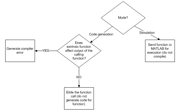 При создании автономного кода для функции, вызывающей foo и включает coder.extrinsic('foo'), генератор кода пытается определить, foo влияет на выходные данные. Если foo не влияет на выход, генератор кода переходит к генерации кода, но исключает foo из созданного кода. В противном случае генератор кода создает ошибку компиляции.