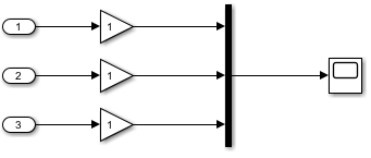 В Simulink Editor создайте модель, содержащую три блока Inport, три блока Gain, блок Mux и блок Scope. Подключите эти блоки, как показано на рисунке: