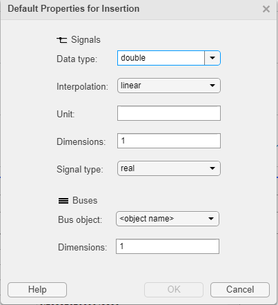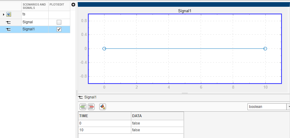Измените свойства по умолчанию для добавляемых сигналов. В разделе Вставка выберите Значения по умолчанию. В диалоговом окне «Свойства по умолчанию для вставки» измените тип данных на booleanзатем щелкните сценарий правой кнопкой мыши и выберите «Вставка» > «Пустой сигнал».