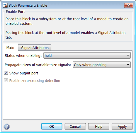 Если для параметра Распространить размеры сигналов переменного размера в родительской подсистеме задано значение Only when enabling, параметр Initial output для блока Output должен быть скалярным значением.