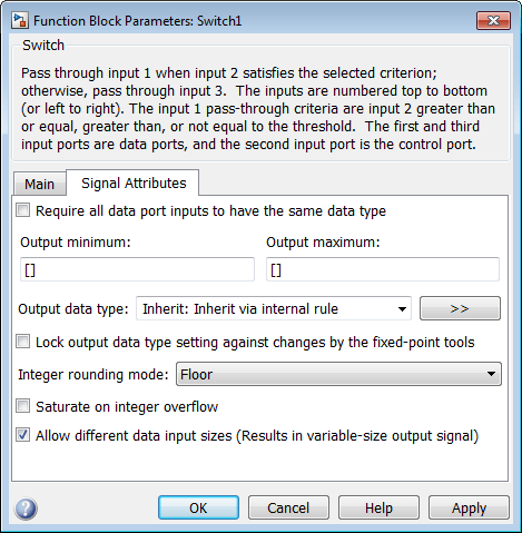 Блоки переключения поддерживают сигналы переменного размера, позволяя входным сигналам различных размеров и распространяя размер входного сигнала на выходной сигнал. Параметр Разрешить различные размеры ввода данных для этих блоков на панели Атрибуты сигнала (Signal Attributes) можно включить или выключить.