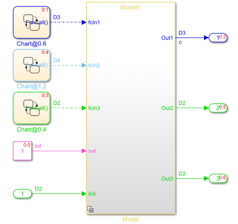В приведенном выше примере fcln1, fcln2, и fcln3 маршрутизируются через исполнительную подсистему с использованием блоков модели в качестве вариантов.