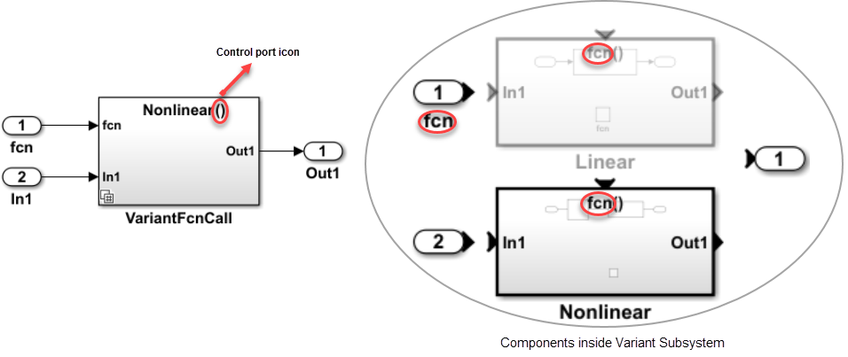 Блок подсистемы, затем другой блок подсистемы (Nonlinear) в блоке Variant Subsystem также должна находиться система Function-Call. Кроме того, порты управления в Linear и Nonlinear блоки и соответствующий блок ввода должны иметь одинаковые имена (fcn).