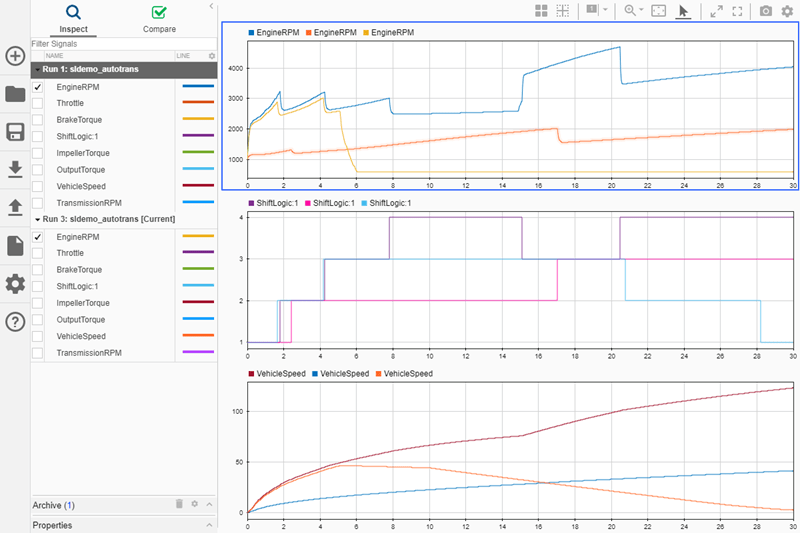 Для большинства задач визуализации можно использовать инспектор данных моделирования. Инспектор данных моделирования интегрируется с регистрацией данных в модели и хорошо работает для визуализации многих сигналов в модели. Используйте сравнения в инспекторе данных моделирования для прототипа, отладки, настройки, калибровки и тестирования моделей. Инспектор данных моделирования поддерживает: