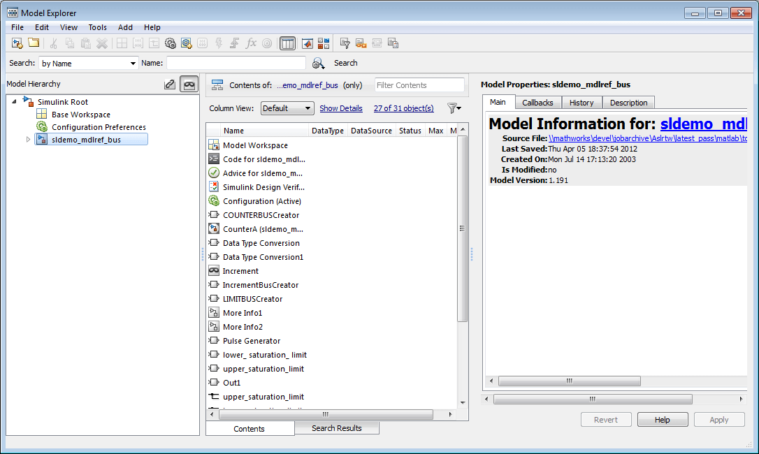 Используйте обозреватель моделей. | Просмотр конфигурации регистрации сигналов в контексте других свойств компонента модели. При необходимости настройте вид столбца для отображения свойств регистрации сигналов. | Просмотр конфигурации регистрации сигналов с помощью проводника моделей |