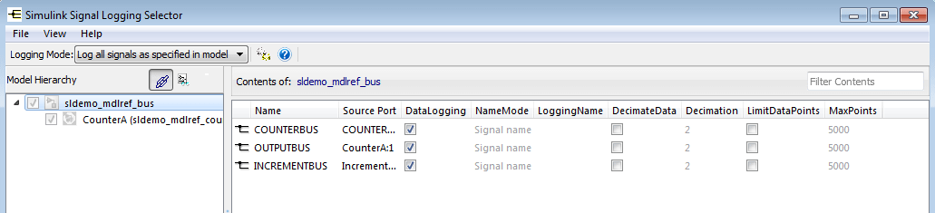 На панели Содержимое (Contents) отображаются сигналы, помеченные для регистрации в узле, выбранном на панели Иерархия модели (Model Hierarchy). Если сигналы не помечены для регистрации в узле, панель Содержимое (Contents) пуста. Используйте стрелку слева от иерархического узла, чтобы развернуть или свернуть содержимое узла на панели Иерархия модели (Model Hierarchy).
