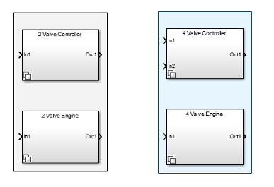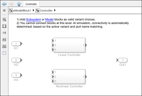 Для иерархической структуры модели. Блок представляет собой шаблон с двумя блоками модели для использования в качестве исполнительных систем. Для вариантов можно добавить блоки модели, а также блоки подсистемы.