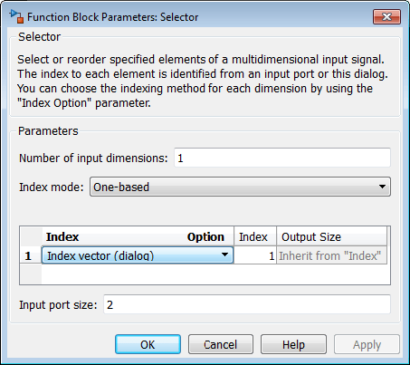 Например, sldemo_bus_arrays модель использует блоки селектора для выбора элементов из массива шин, выводимых блоками «Назначение» и «Для каждой подсистемы». В этом примере показано диалоговое окно «Параметры блока» для блока выбора, в котором выбирается первый элемент: