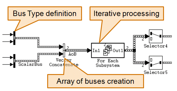 Можно выполнить итеративную обработку данных шины массива шин с использованием таких блоков, как блок «Для каждой подсистемы», блок «While Iterator Subsystem» или блок «For Iterator Subsystem». Один из этих блоков можно использовать для выполнения одного и того же вида обработки: