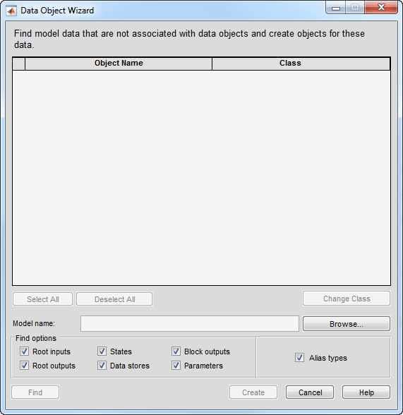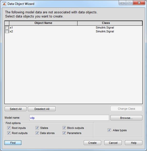 Для создания объектов данных, представляющих сигналы, параметры и состояния в модели, можно использовать мастер объектов данных. Мастер находит в модели данные, не имеющие соответствующих объектов данных.