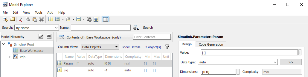 Параметр или сигнальный объект появляется в базовой рабочей области. Имя по умолчанию для новых объектов параметров: Param. Имя по умолчанию для новых сигнальных объектов: Sig.