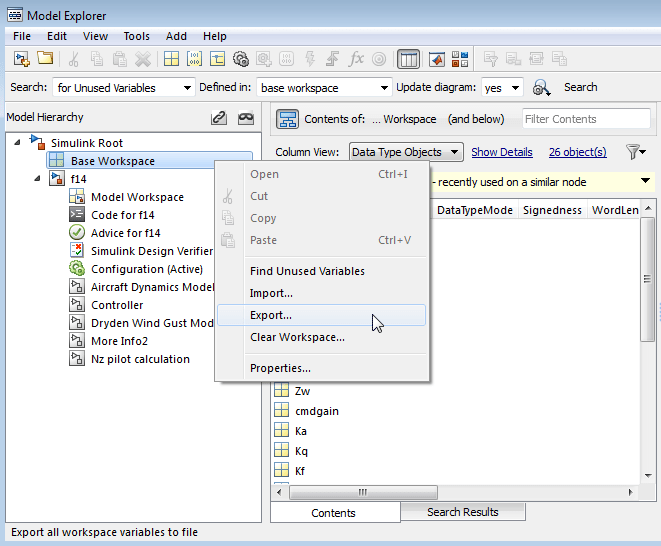Чтобы выбрать все переменные в рабочей области, щелкните правой кнопкой мыши узел рабочей области (например, Base Workspace) и выберите пункт меню «Экспорт». Например: