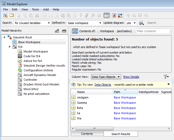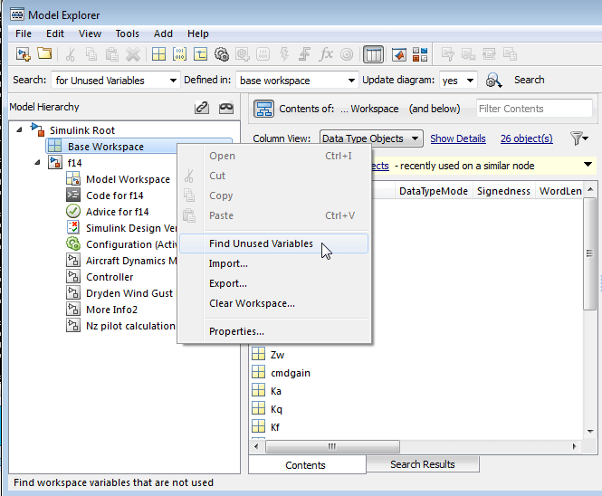 В обозревателе моделей можно получить список переменных, определенных в рабочей области, но не используемых моделью или блоком. Один из способов получить этот список переменных - щелкнуть правой кнопкой мыши имя рабочей области на панели Иерархия модели (Model Hierarchy) и выбрать пункт меню Найти неиспользуемые переменные (Find Unused Variables). Например: