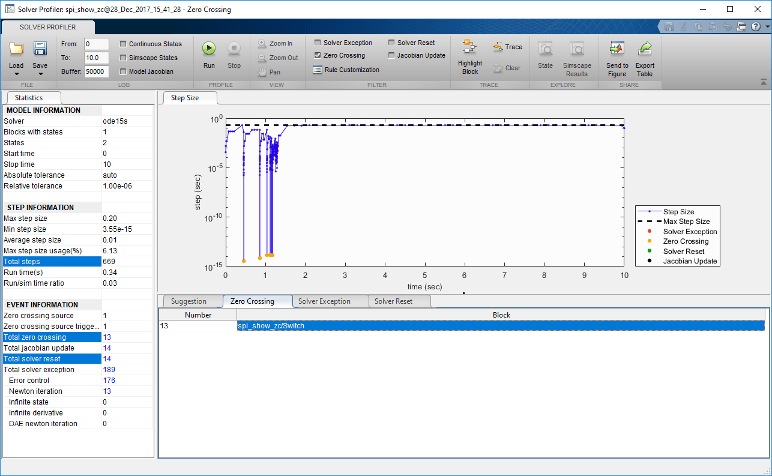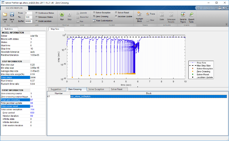 При запуске профилировщика решателя для этой модели модель моделируется в 2898 шаги и то, что он запускает 67 нулевое пересечение событий. Чтобы выделить события пересечения нулей на графике размера шага, перейдите на вкладку «Пересечение нулей» и выберите блок, вызывающий событие.
