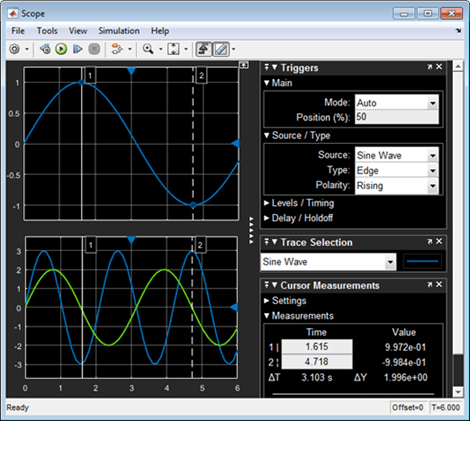 Блоки области и средства просмотра области обеспечивают быстрый способ визуализации данных моделирования с течением времени. При создании прототипа модели подключите сигналы к блоку области, смоделируйте модель и просмотрите результаты в окне области. Используйте результаты для проверки проекта. Если требуется отладка модели, для обнаружения проблемы используйте инструменты, похожие на осциллограф (триггеры и измерения курсора), доступные в области. Дополнительные сведения см. в разделе Прототипы и отладочные модели с областями.