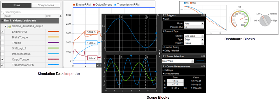 Simulink ® предоставляет несколько методов просмотра и анализа результатов моделирования. Блоки области и средства просмотра области позволяют быстро подключать сигналы для визуализации результатов и отладки моделей. Инспектор данных моделирования позволяет просматривать и проверять данные сигналов из интерактивного моделирования или импортированных данных, а также группировать данные из нескольких моделирований.