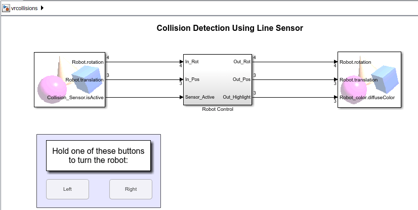 Обнаружение столкновений можно использовать для манипулирования объектами виртуального мира независимо от модели Simulink или объекта виртуального мира в MATLAB.
