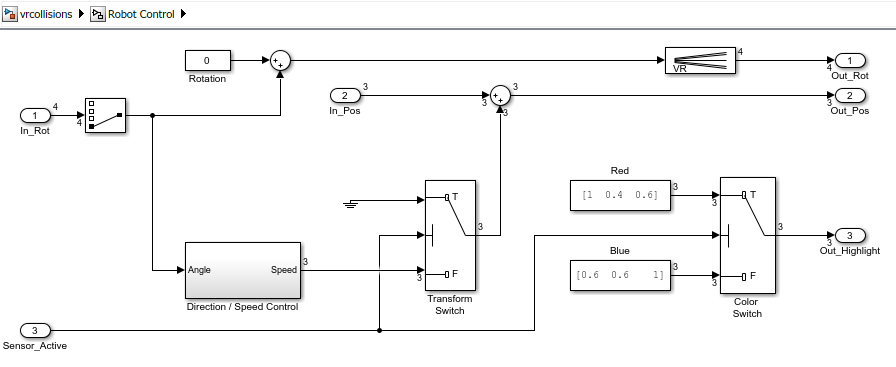isActive выходное свойство датчика становится TRUE при столкновении. Чтобы связать модель со сценой виртуальной реальности, можно использовать блок VR Source для считывания датчика isActive и текущее положение объекта, для которого определен датчик. Блок VR Sink можно использовать для определения поведения объекта виртуального мира, например его положения, поворота или цвета.