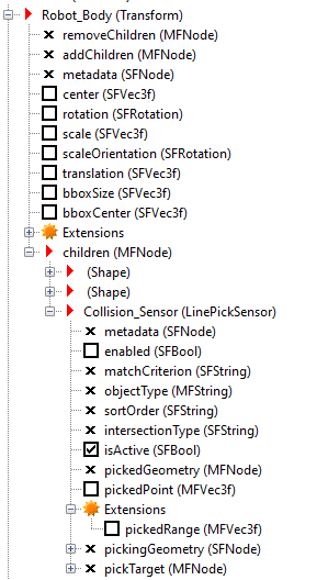 Collision_Sensor определяет датчик обнаружения столкновения для робота. Узел датчика pickingGeometry указывает на использование Line_Set узел как геометрия комплектации и Walls_Obstacles узел в качестве целей для обнаружения столкновений.