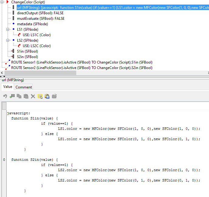 Код VRML включает ROUTE узлы для каждого из датчиков захвата.