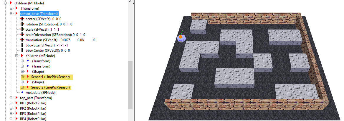 vrmaze виртуальный мир определяет два зеленых IndexedLineSet датчики захвата (Sensor1 и Sensor2) для фиолетового робота (Robot узел).