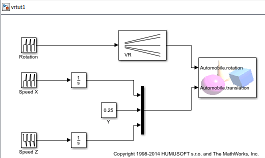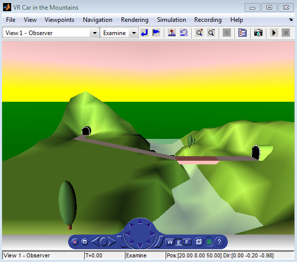 В этом примере объясняется, как отобразить смоделированный виртуальный мир с помощью Simulink ® 3D Animation™ Viewer на главном компьютере. Средство просмотра Simulink 3D Animation Viewer используется по умолчанию и рекомендуется для просмотра виртуальных миров. Откроется окно Simulink с моделью простого автомобиля. Траектория движения автомобиля (положение и угол) просматривается в виртуальной реальности: