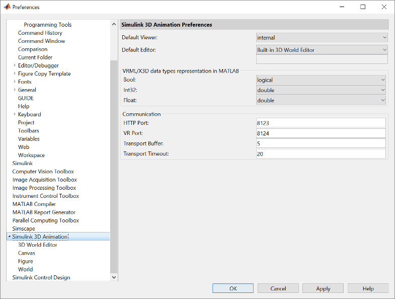 3D предпочтения Анимации Simulink включают следующие предпочтения 3D Мирового Редактора.